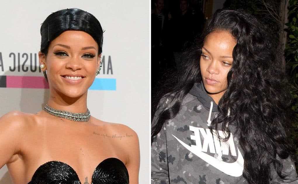 Рианна. Одна их первых селебрити, которая стала появляться на публике без макияжа. Хоть Рианна и обладает ровным тоном кожи и отсутствием морщин, все же ее внешность значительно отличается от той, которую мы чаще всего видим на таблоидах.