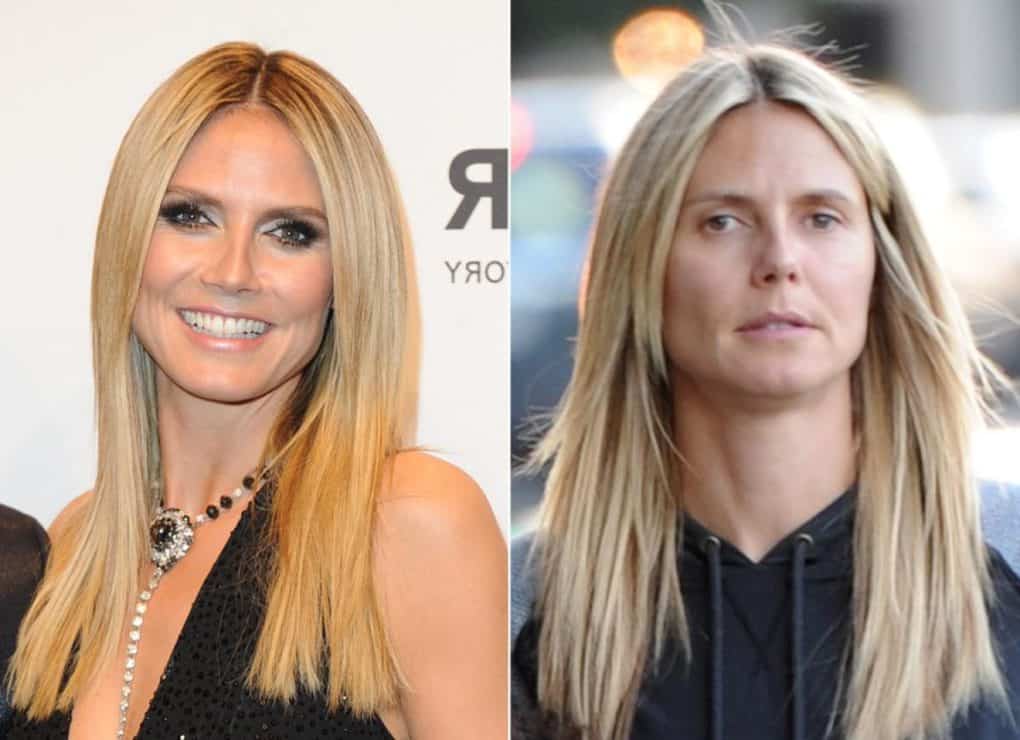 Немецкая супермодель не стесняется своего естественного внешнего вида и иногда позволяет себе выйти на улицу без макияжа. После этого ее фотографии без грима свободно «гуляют» в сети, и вызывают довольно противоречивые отзывы. Некоторые говорят, что 45-летняя знаменитость выглядит гораздо старше своих лет, даже называют ее старушкой. Другие же находят ее привлекательной и без макияжа. Возможно поклонники просто привыкли видеть звезду «при параде». Она очень ярко красится, часто делает акцент на глаза. Поэтому без ярких красок лицо ее кажется невыразительным. Это лицо обычной женщины. Причем нужно отдать должное Хайди, за кожей она ухаживает, ни явных морщин, ни кругов под глазами у нее нет.