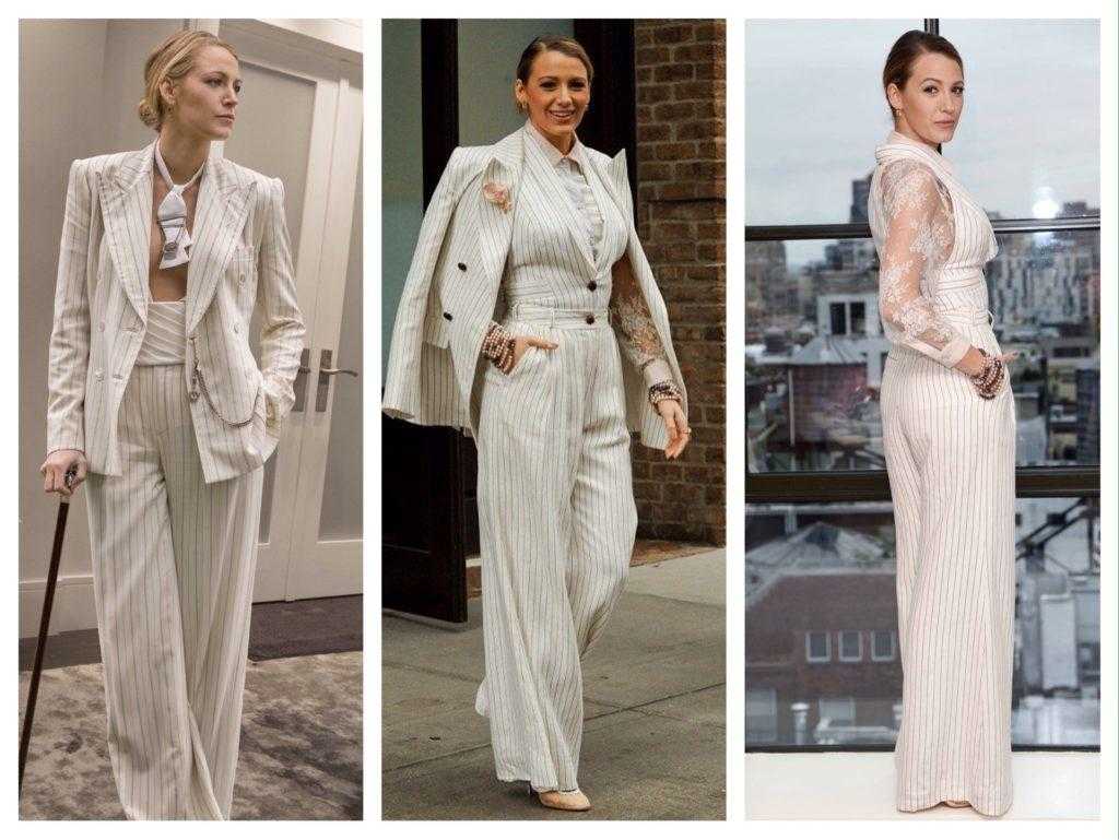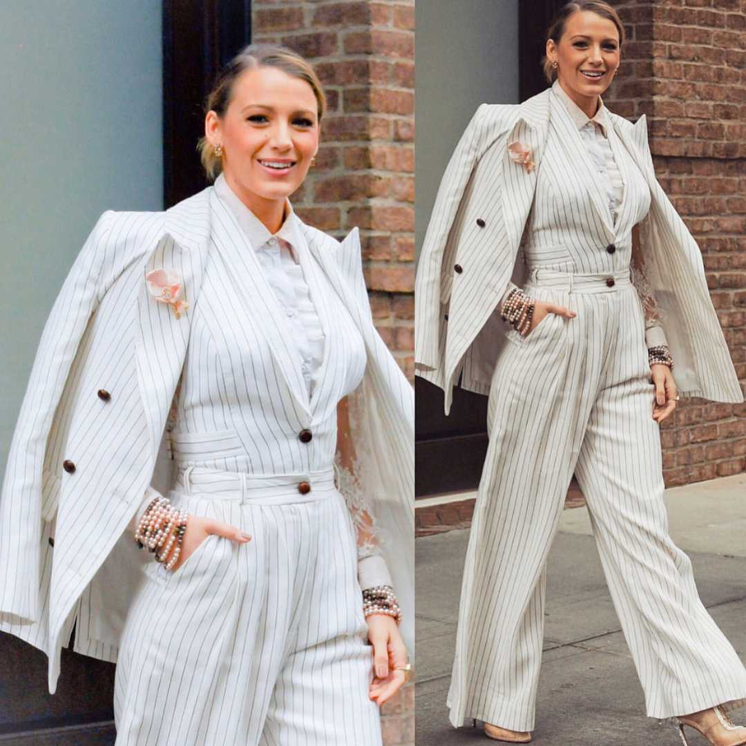 Благородный белый, изысканная тонкая полоска, ажурное кружево, приталенный жилет – все это детали последнего образа Блейк Лайвли, за который критики и журналисты тут же прозвали ее «Леди Босс». Костюм-тройку с широкими брюками в пол и полупрозрачной белой блузкой актриса дополнила любимыми лодочками на шпильке из коллекции Christian Louboutin и украшениями Lorraine Schwartz.