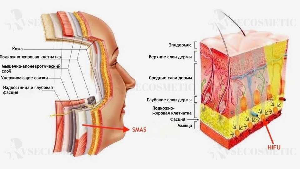 Аббревиатура SMAS с английского языка расшифровывается как Superficial Muscular Aponeurotic System. SMAS – это поверхностная мышечно-апоневротическая система, лежащая в основе мускулатуры лица. Проще говоря, это слой ткани под кожей, благодаря которому двигаются мышцы лица, когда вы хмуритесь, улыбаетесь, насупливаете бровки или удивляетесь. Своеобразный мышечный каркас под эпидермисом и подкожно-жировой клетчаткой. Если соединительная ткань (эластин+коллаген), из которой состоит SMAS теряет свою эластичность, повреждается и не функционирует, у нас появляются морщины, второй подбородок, носогубные складки, обвисшие щеки и другие «прелести» старения.Ранее на SMAS можно было воздействовать только с помощью операции. Хирурги совершали лифтинг лица посредством «высечения» старых, потерявших тонус, тканей и подтяжкой тех, что способны держать мышечный каркас лица. Поверхностная мышечно-апоневротическая система была открыта французскими учеными Владимиром Митцем и Мартином Пейрони в 1975 году, они первыми описали это слой ткани и его важную роль в лицевой анатомии. Хирурги взяли на вооружение открытие и начали проводить подтяжку именно этого слоя кожи, добиваясь ошеломительного визуального лифтинг-эффекта.