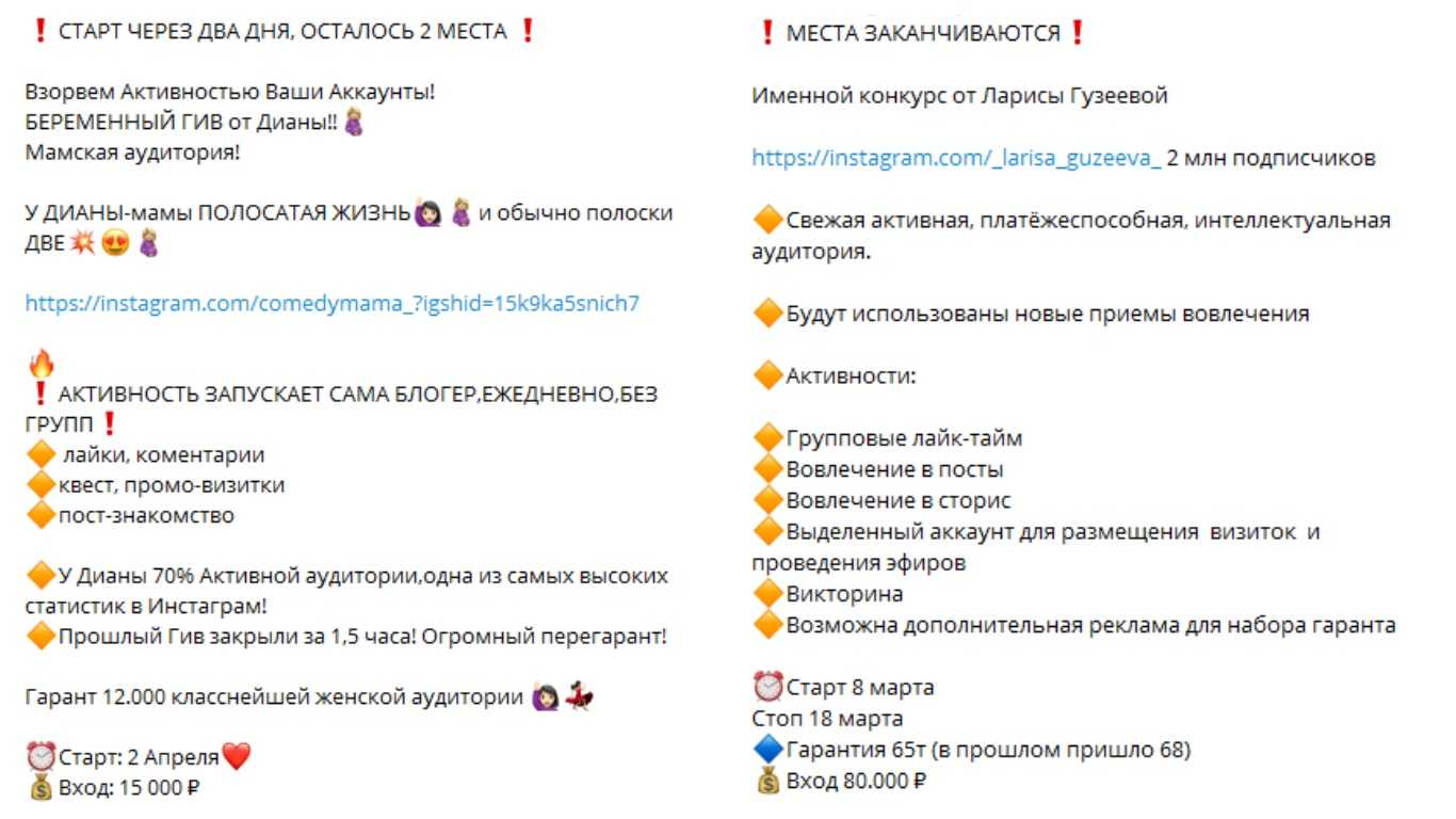 Организовать активность можно по личной договоренности с друзьями-блогерами или поискать других участников в Telegram чатах. Также мы рассказали о видах рекламы и ее стоимости в соц. сети Instagram, тебе будет полезно знать эту информацию.
