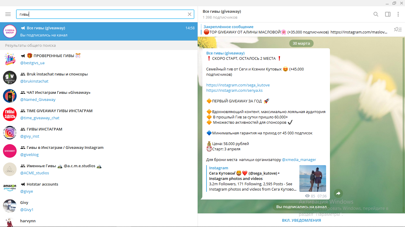 - Найти несколько площадок для проведения Гива, по возможности почитать отзывы, оценить аудиторию страниц, посмотреть статистику, несколько дней понаблюдать за активностью в выбранных аккаунтах. Всегда есть риск нарваться на мошенников, которые возьмут деньги и ничего не сделают.