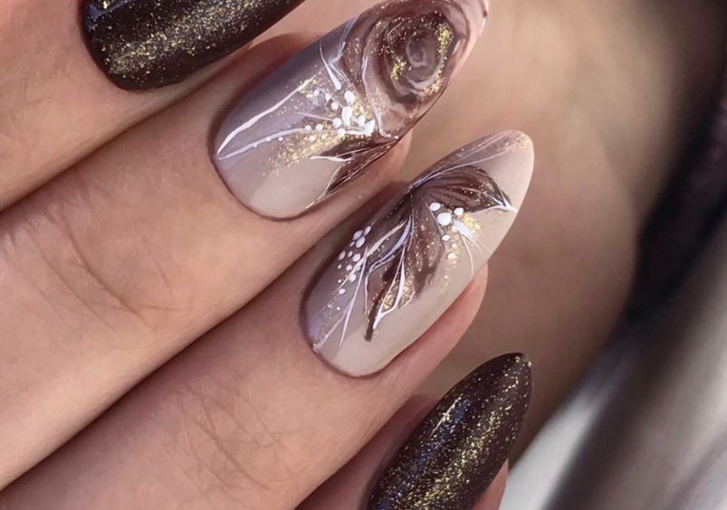 - акцент на одном ногте. Покройте большинство ногтей шоколадным лаком, а на одном ногте сделайте интересный акцент, например, нанесите золотистый узор, стразы или абстрактный рисунок;