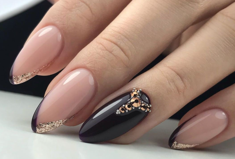 Популярным видом декора выступают золотые стразы и блестки. С помощью них можно создать по-настоящему роскошный маникюр.