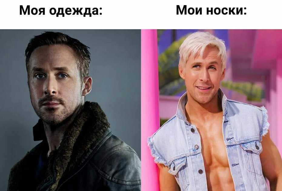 Но амплуа депрессивного героя с томным взглядом настолько закрепилось в интернет-культуре, что новый прилизанный образ не обманул пользователей соцсетей. Появился мем о контрасте между привычными ролями Гослинга: кто-то их противопоставлял, а кто-то объединял в кроссоверы.