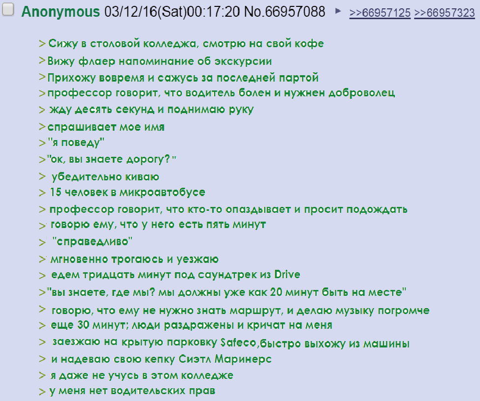4chan выделился гринтекстовыми историями, когда аноним действовал как Водитель в реальной жизни.