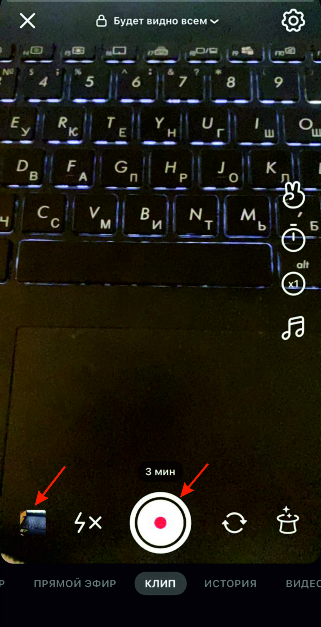 Чтобы опубликовать клип, в мобильном приложении ВКонтакте откройте раздел «Клипы» и нажмите на фотокамеру в правом нижнем углу экрана.