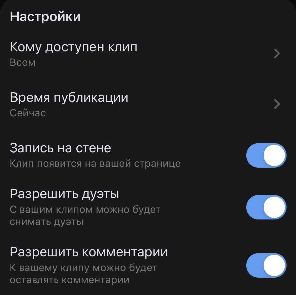 Поставьте отметку о публикации записи на стене, так подписчики увидят ваш ролик. Разрешите или отключите комментарии, дуэты.