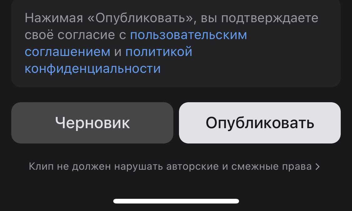 Нажмите кнопку «Опубликовать» или сохраните клип в черновике, чтоб вернуться к нему позднее.
