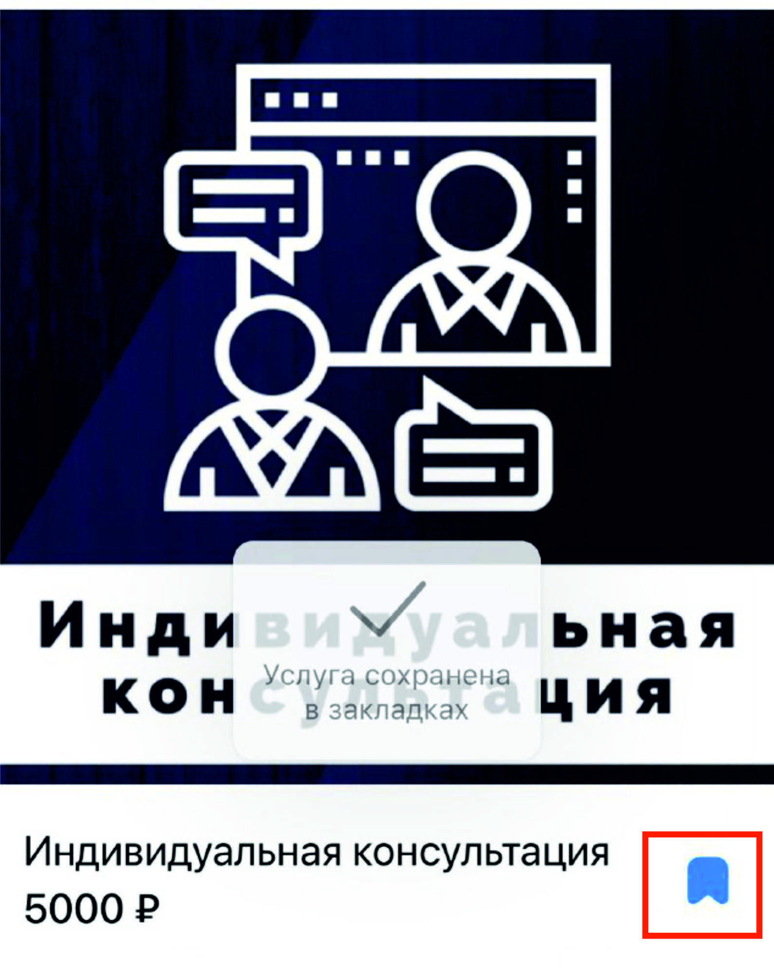- Сначала добавьте нужный товар или услугу в закладки. Для этого нажмите на значок «Закладки» в карточке товара.