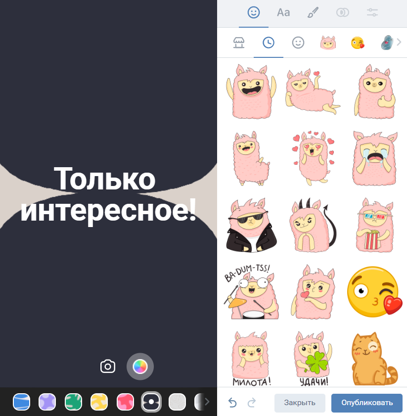 Сторис можно добавить в приложении или с десктопа. Путь примерно одинаковый: нужно снять или загрузить фото или видео, добавить текст, маски, эффекты и нажать кнопку «Опубликовать».