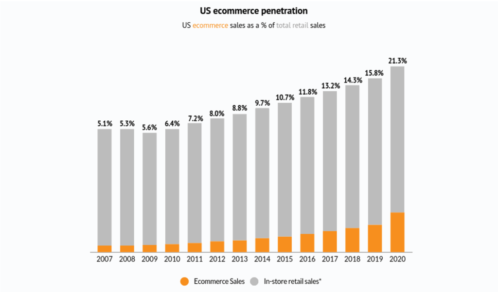 Катализатором роста стала пандемия, когда потребители вынужденно стали проводить больше времени дома. Но не она задала тренд — электронная коммерция толкает розничные продажи ещё с середины нулевых.