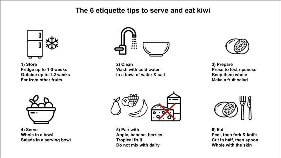 Этикет киви — это свод правил, как правильно подавать и есть киви. Такие правила помогают избежать поведения, которое может вызвать неуважение к хозяевам или гостям или заставить вас выглядеть невежливо.