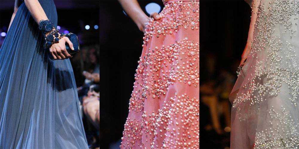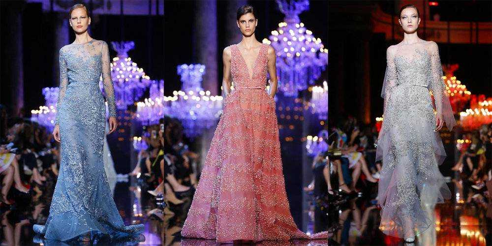 Роскошные вечерние платья – константа творчества Эли Сааба. Подиум на показе осенней коллекции 2014 освещался приглушенным светом восхитительных хрустальных люстр. Основным украшением новой коллекции стал жемчуг – им было вышито примерно всякое платье в коллекции.