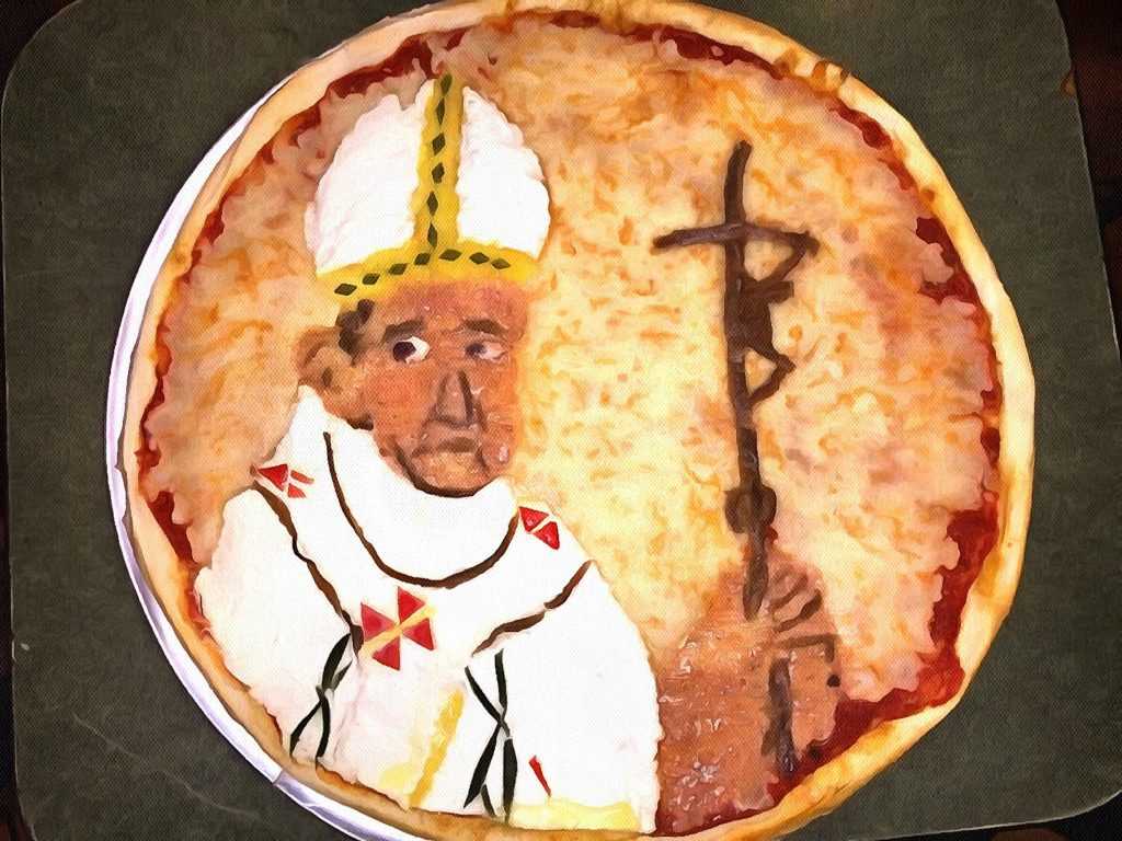 Искусство на пицце может быть не так популярно, как, скажем, искусство на кексах, но это не помешало творческой пиццерии на Блеккер-стрит в Нью-Йорке изобразить пиццу с лицом папы Римского — Папы Фрэнсиса во время его папского визита в Нью-Йорк в 2015 году.
