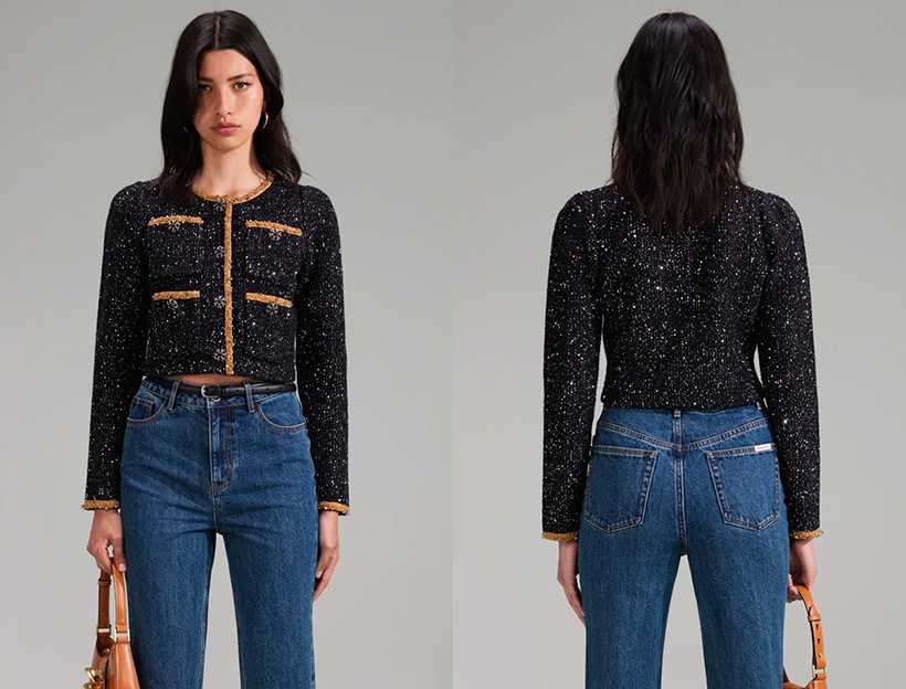 As I said in the opening paragraph, Kate dazzled in a black sequin cropped cardigan from Self-Portrait. The garment is trimmed with gold and finished with beads and gems, and features diamanté buttons on the pocket flaps. It is crafted from a wool-mix fabric.