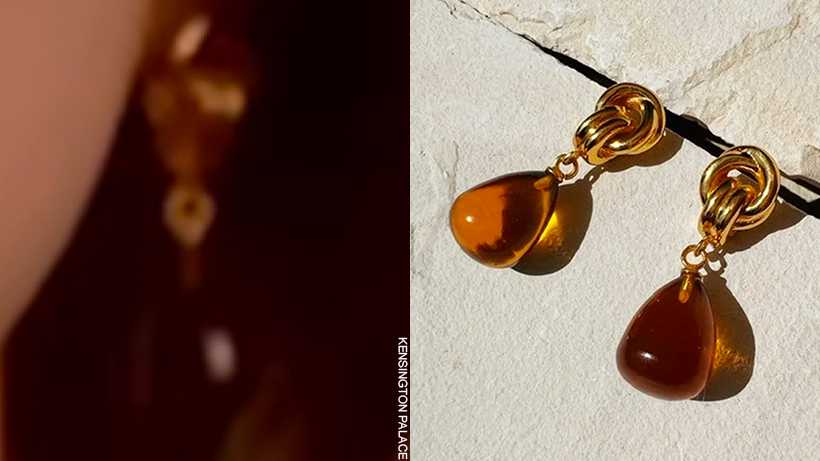 Ashley from Middleton Maven confirmed that Kate wore a pair of Shyla London’s Chunky Knot Soft Citrine Earrings with the cardigan. Shyla confirmed the ID on their Instagram stories. It’s hard to see the earrings in the still—you might be better watching the video and enlarging/pinching the screen to zoom.