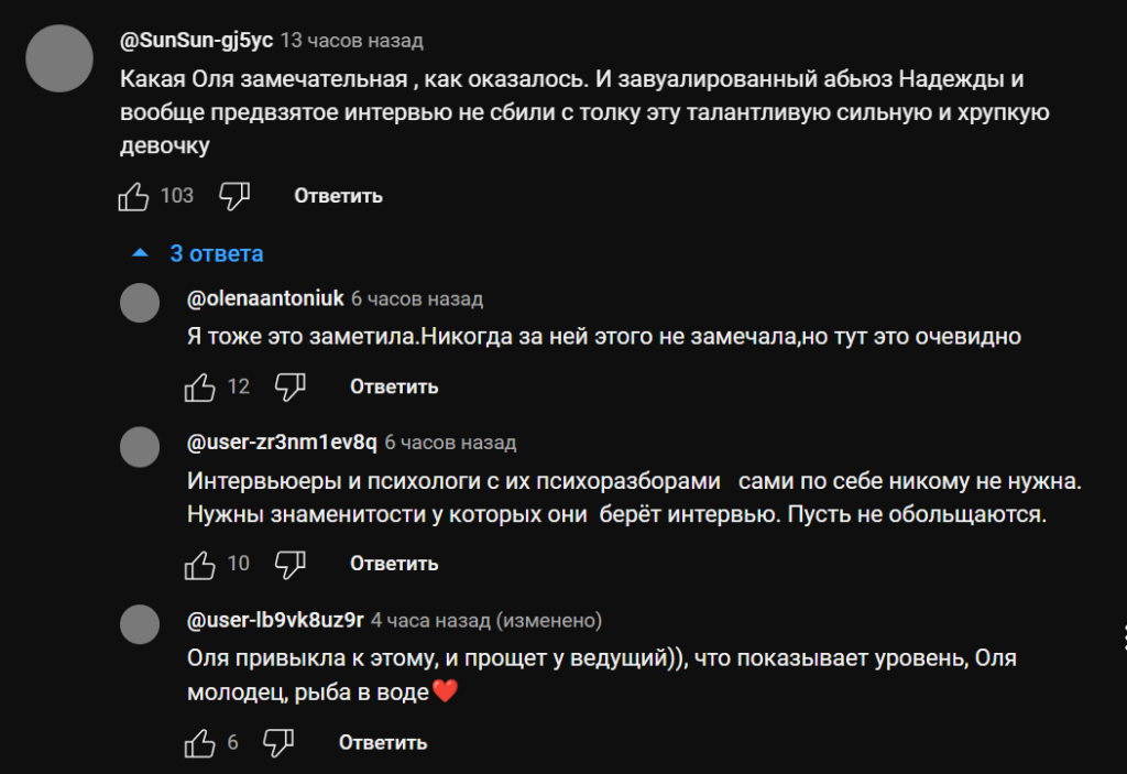 Отметим, что Ольга действительно с завидной регулярностью подвергалась насмешкам коллег и даже оскорблениям. В интервью Стрелец она сказала, что после конфликта с Губерниевым, она улетела в подруге восстанавливаться. А после съемок в интервью у Собчак у нее пропал голос на фоне стресса.