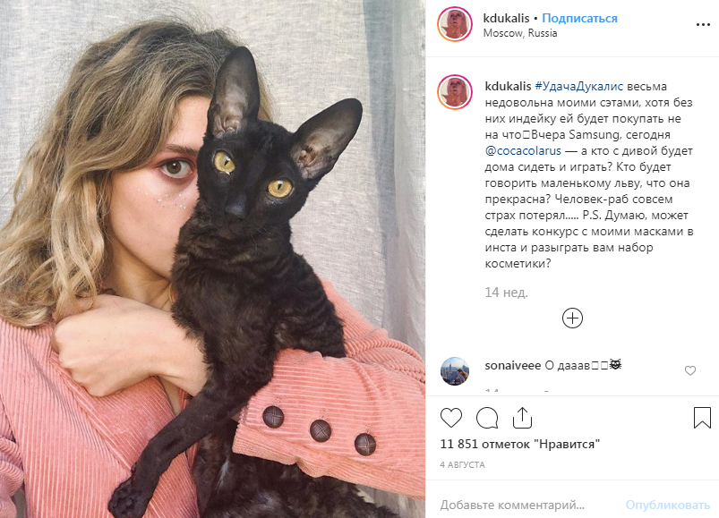 - Большая любительница животных, девушка имеет домашнего питомца. Это кошка породы «корниш-рекс», красотка по имени Удача (еще варианты ее имен – Удо, Удон). «Она невероятно скрашивает мне жизнь, и позволила реализовать мечту о коте – только эта порода не вызывает у меня аллергии», – из поста хозяйки Удо в Инстаграме.