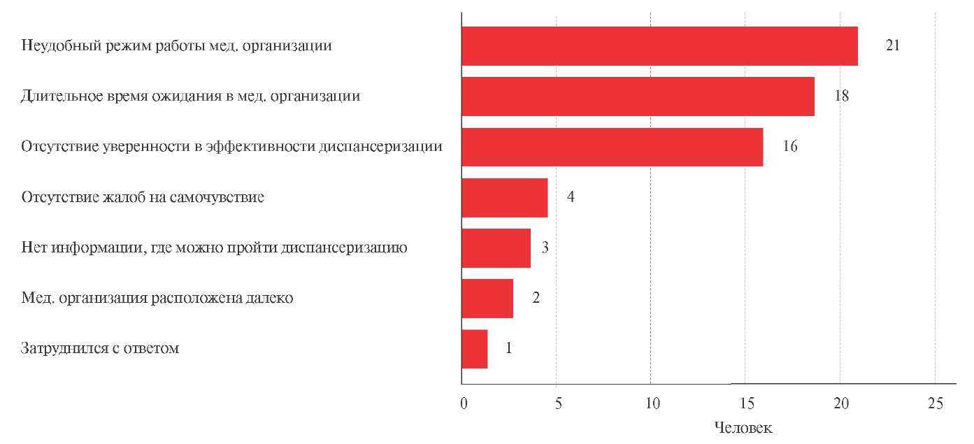 Прохождение диспансеризации. О прохождении диспансеризации (намерении участия в ней) сообщили 51,4% (95% ДИ: 49,3-53,5) (n=1139) участников исследования. Среди причин неявки на диспансеризацию осведомленными о ней и приглашенными на нее городскими жителями, имеющими АГ в анамнезе (n=106), наиболее часто отмечались неудобное время работы медицинских организаций, проводящих диспансеризацию — 19,1% (n=21), а также необходимость длительного ожидания получения медицинских услуг — 16,4% (n=18) (рисунок 2).
