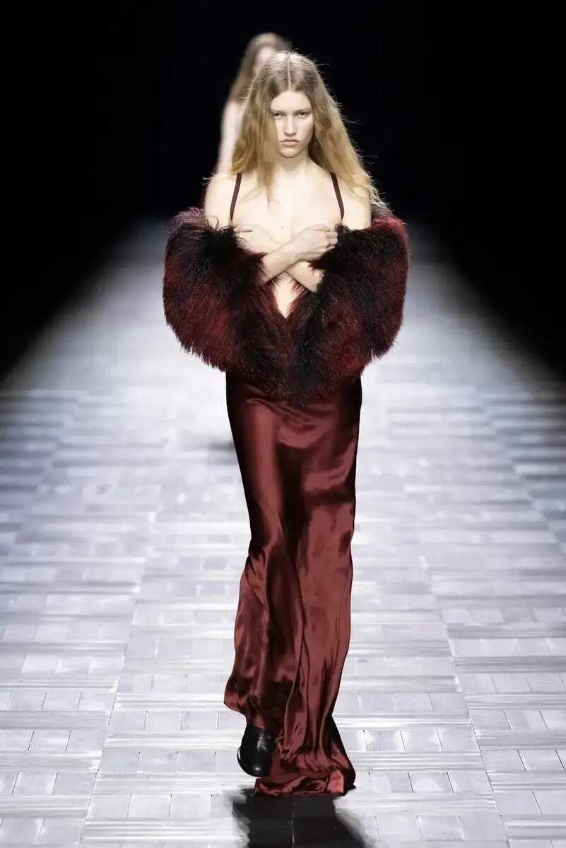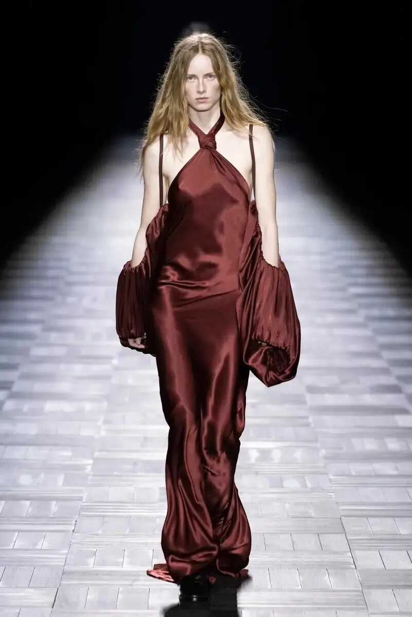 В то время как Маттье Блази предлагает радикальную, гипнотическую версию красного платья в Bottega Veneta, этот предмет одежды представлен в минималистичных вариантах из сетки в Courrèges, Loewe и Fendi, а также из кожи в Alexander McQueen и Proenza Schouler. Прозрачные, украшенные кружевом или оборками, броские сексуальные красные платья на подиумах Mugler, Blumarine, Dilara Findikoglu, Gucci и Ester Manas, несомненно, соблазнят it-girls, которые готовы на все, чтобы быть замеченными — даже бросить вызов холоду. Наконец, Ferragamo, Lanvin и Michael Kors подписали коллекцию красных дискотечных платьев из тканей с ламе или пайетками, к величайшему удовольствию тусовщиц. Запомнилась и Каролина Эррера с ее величественным вечерним платьем тон-в-тон из ткани с цветочным принтом.