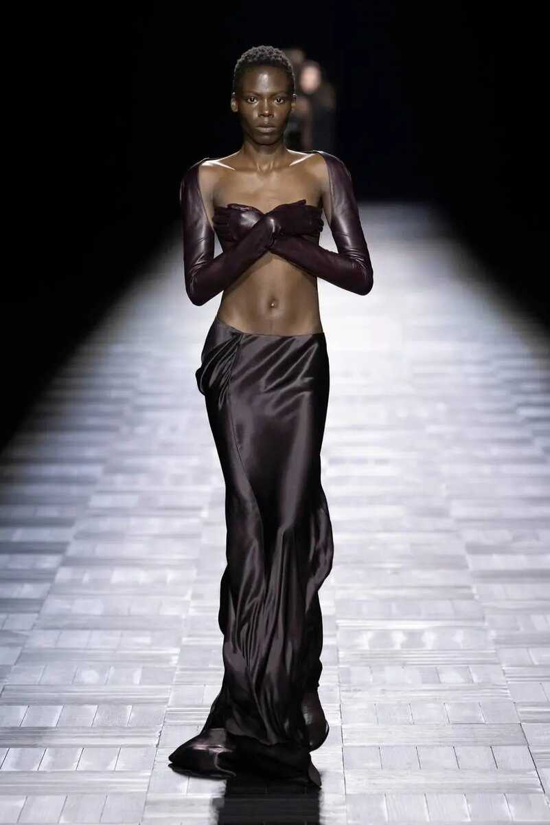 Еще одна сильная тенденция показов осень-зима 2023-2024 — драпированная и чувственная кожа. Она триумфально проявляется в ультраплавных костюмах Людовика де Сен-Сернина в его первой коллекции для Ann Demeulemeester, а также в широких палантинах, обернутых вокруг плеч у Saint Laurent.