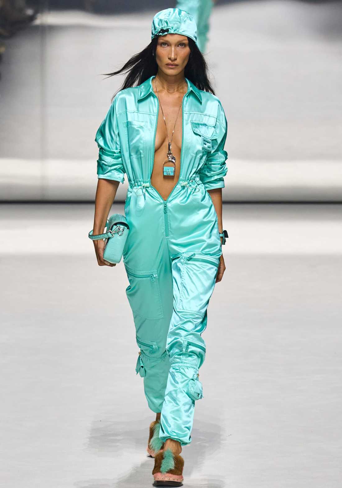 На открывающем показ Gucci силуэте он имеет форму серебряной цепочки, на которой выделяются два маленьких треугольника с логотипом Дома, едва прикрывающие соски.
