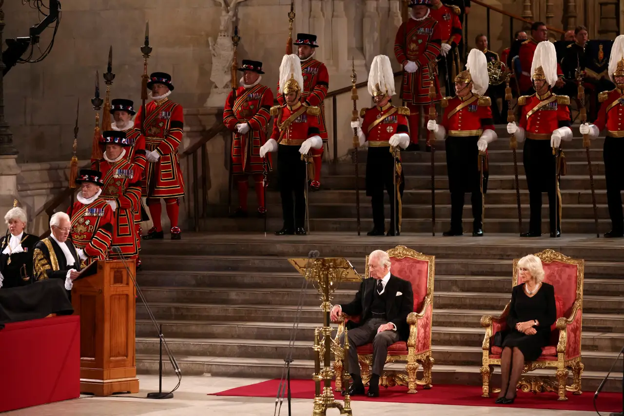 - По традиции после коронации члены монаршей семьи и пэры преклоняют перед королем колено, клянутся в верности и целуют правую руку. Однако на этот раз ритуал совершил лишь наследный принц Уэльский Уильям. Вместо пэров архиепископ попросил людей в аббатстве и зрителей дома поклясться в верности новому монарху.