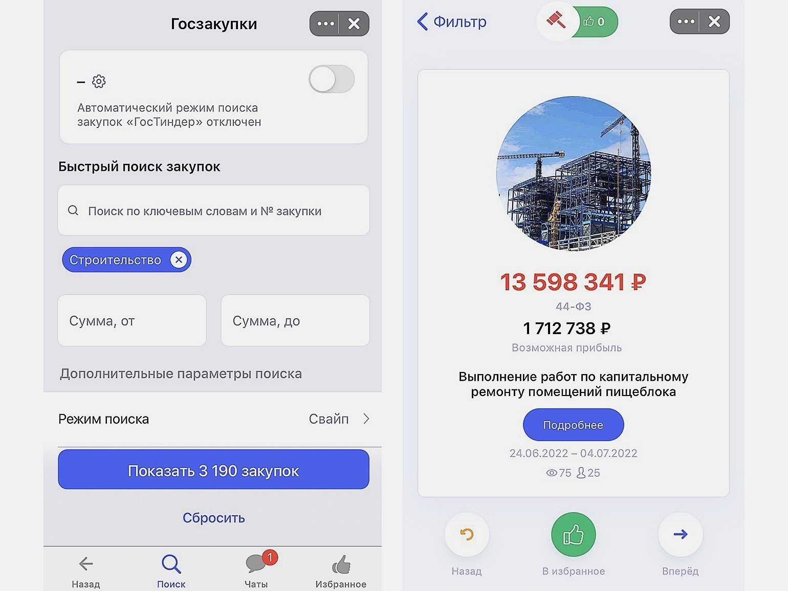- Госзакупки. Сервис для поиска государственных контрактов. Включает инструмент «ГосТиндер» — он позволяет отбирать понравившееся тендеры с помощью свайпа. Можно оставить заявку на участие в тендере: после этого специалист TenChat свяжется с вами и поможет в оформлении официальной заявки. Услуга платная.