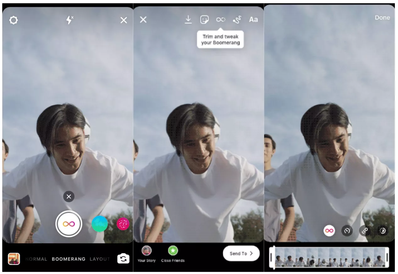 В конце 2016 года у пользователей Инстаграм появилась возможность непосредственно в Stories снимать ролики с опцией BOOMERANG — маленькие закольцованные. Сториз позволяет также снимать видео без удержания кнопки записи, благодаря опции «свободные руки».