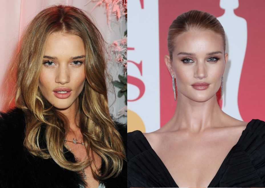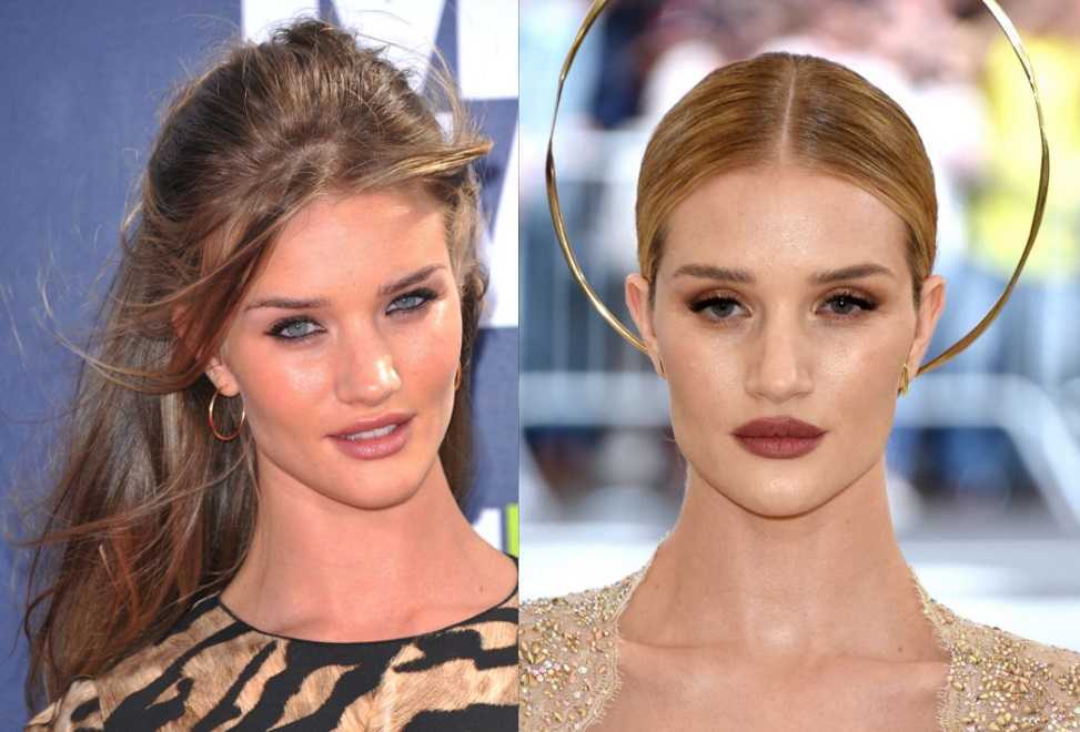 У Хантингтон-Уайтли есть секрет увеличения губ: после душа она растирает их полотенцем, наносит бальзам, а затем рисует контур чуть выше естественной линии. Правда, некоторые эксперты считают, что пухлые губы Рози следствие не только генетики и косметических ухищрений, а грамотной работы косметолога: на определенных этапах карьеры верхняя губа меняла объем. Но это только догадки, а вот ринопластика не вызывает сомнений: подиум покоряла девочка с большим фактурным носом, а возлюбленной Стэтхэма стала уже красотка с изящным носиком.