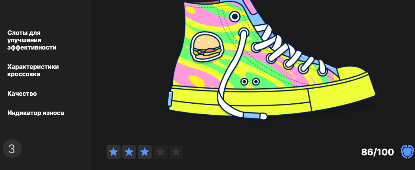 - активность пользователя вознаграждается внутренними токенами системы, что пригодны для использования на прокачку кроссовок, а также со временем будут продаваться, принося реальные деньги;