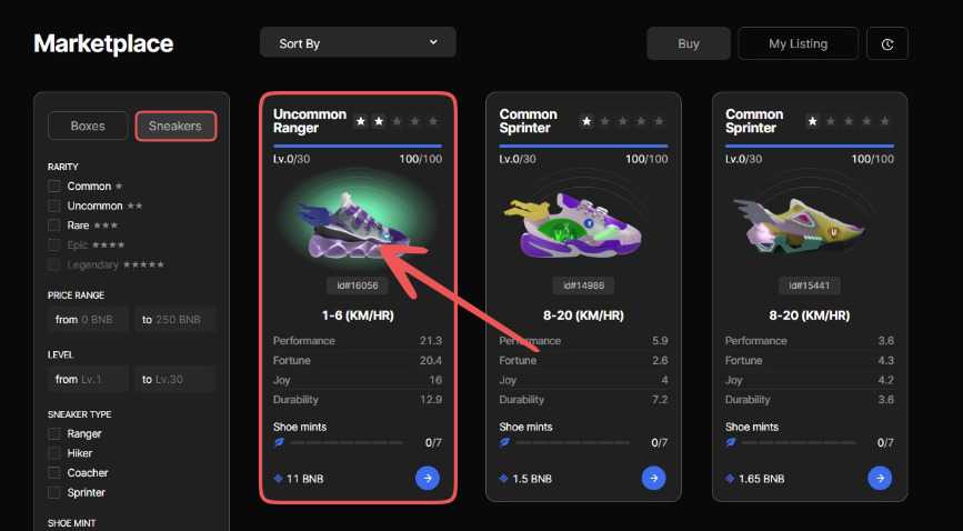 Цена кроссовок Amazy стартует от 100 долларов, купить их можно на маркетплейсе в одноименном разделе. После перехода необходимо авторизоваться в МетаМаск и провести оплату. После проведения сделки обувь должна появиться в списке инвентаря.