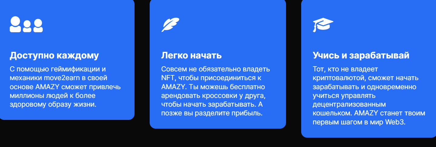 Цель приложения Amazy Косенко — привлечение людей к здоровому образу жизни и поощрение криптовалютой. Человек устанавливает приложение, покупает NFT-кроссовки и получает токены за активность. Обувь для занятия спортом можно покупать или сдавать в аренду, а минимальная сумма для входа — от 100 долларов.