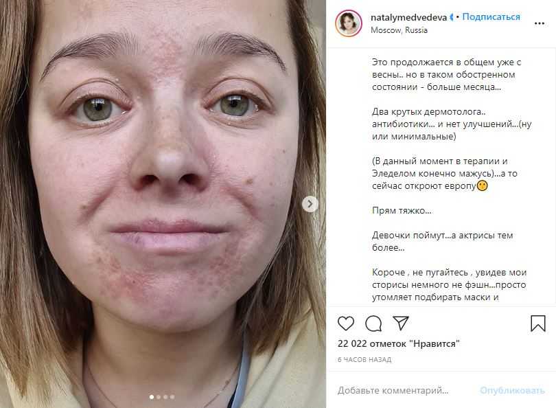 Действительно, неправильное питание, нервозность, недостаточное употребление чистой воды могут повлиять на состояние кожи. Однако лучший совет Медведевой сможет дать специалист. Остается только надеяться на лучшее и проявить уважение к артистке: не каждая на ее месте отважилась бы опубликовать кадры, на которых она предстает не в самом лучшем виде.
