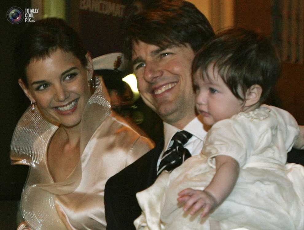 Том Круз приветствует свою жену Кэти Холмс, которая держит на руках их дочь Сури, в Нью-Йорке.