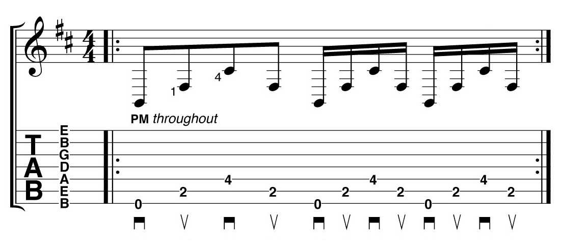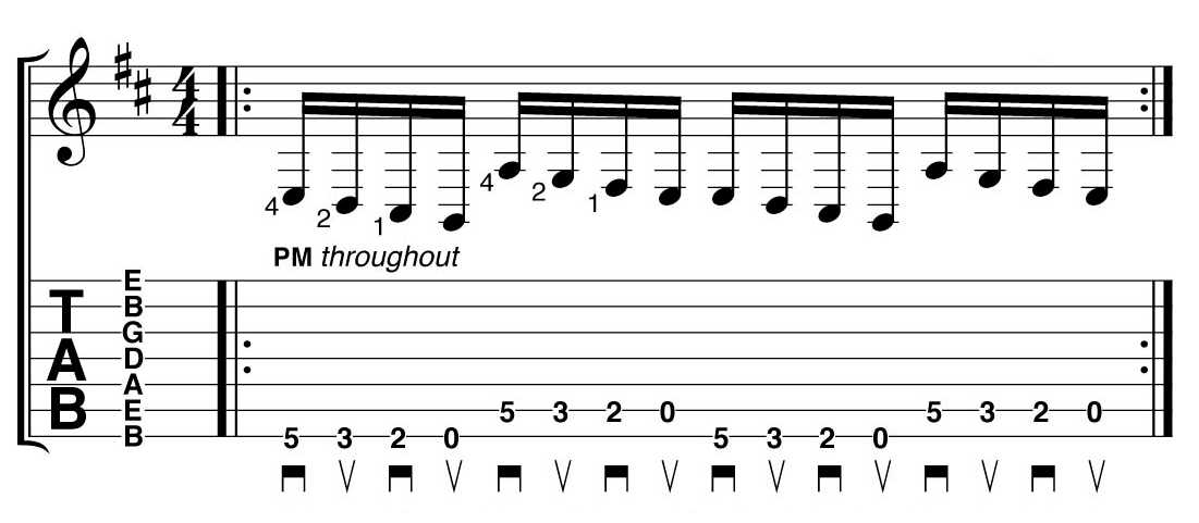 Игра мелодических отрезков также потребует приглушения, но глушить мы будем нижние струны, чтобы избежать грязи и лишних шумов (см. Пример 2 выше).