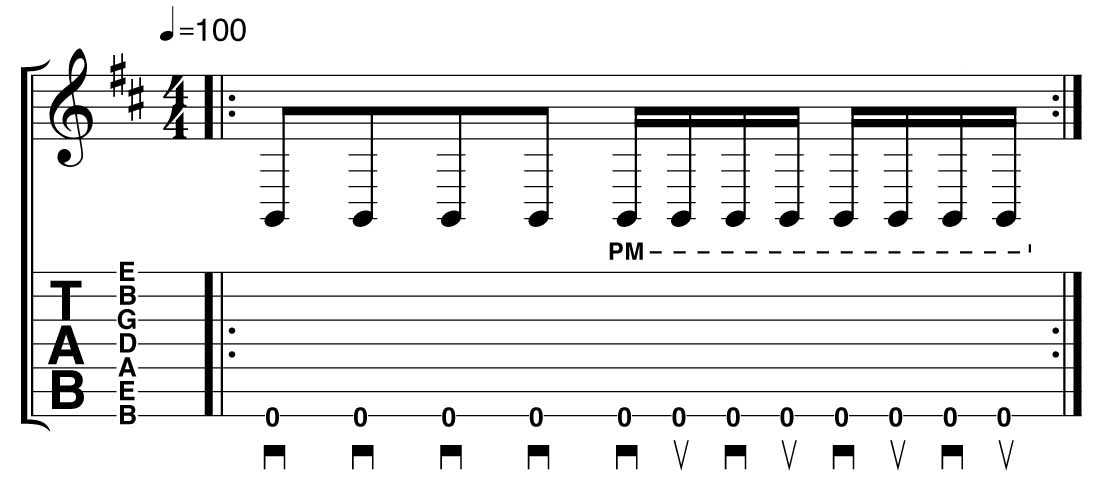 Чтобы понять, как играть на семиструнной электрогитаре, поиграйте простое упражнение с применением глушения ладонью (palm muting). Упражнение поможет понять специфику игры на семиструнной гитаре и научит контролировать резонанс инструмента.