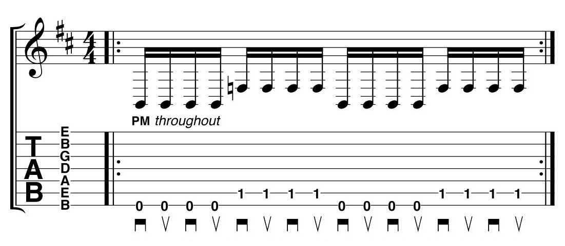 Самый сложный момент в примере — переход с ритмической линии на мелодическую. Отработайте переход очень медленно и постепенно набирайте скорость. При исполнении мелодической линии глушите нижние струны, чтобы избежать появления грязи во время игры.
