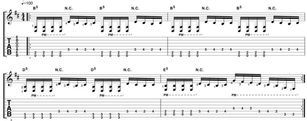 Пример на основе стиля игры Криса Бродерика из Megadeth и Act of Defiance. Пример исполняется во фригийском ладу (см. ).