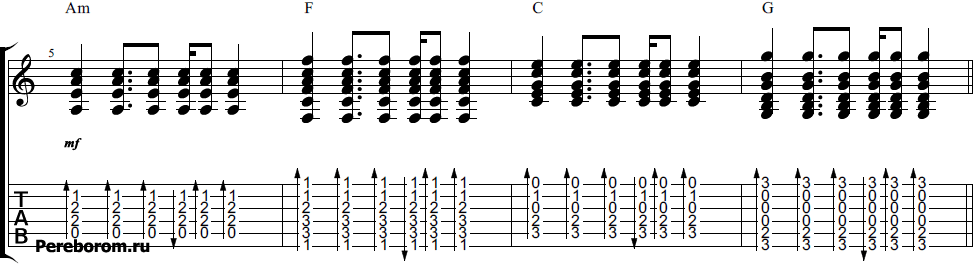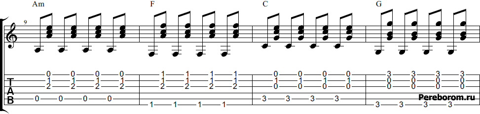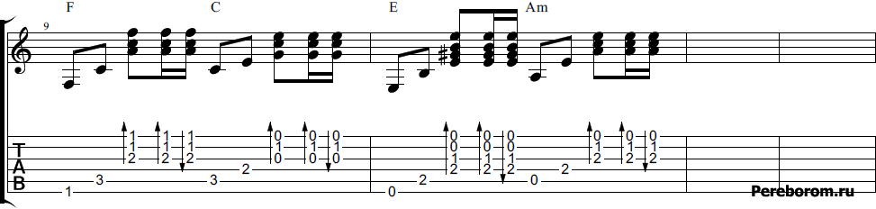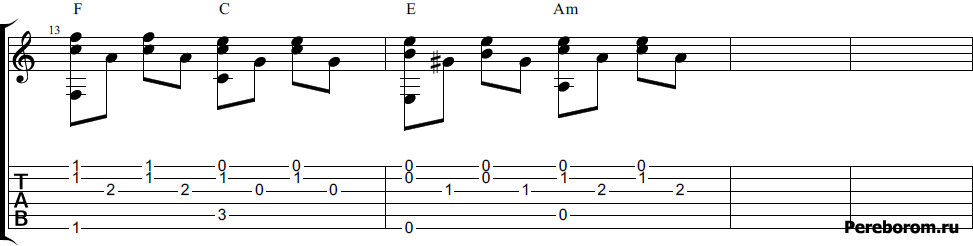 Сначала необходимо провести пальцем сверху вниз по аккорду. Затем играем перебор по схеме «3-2-3-1-3-2-3». Далее идёт смена аккорда и вновь перебор