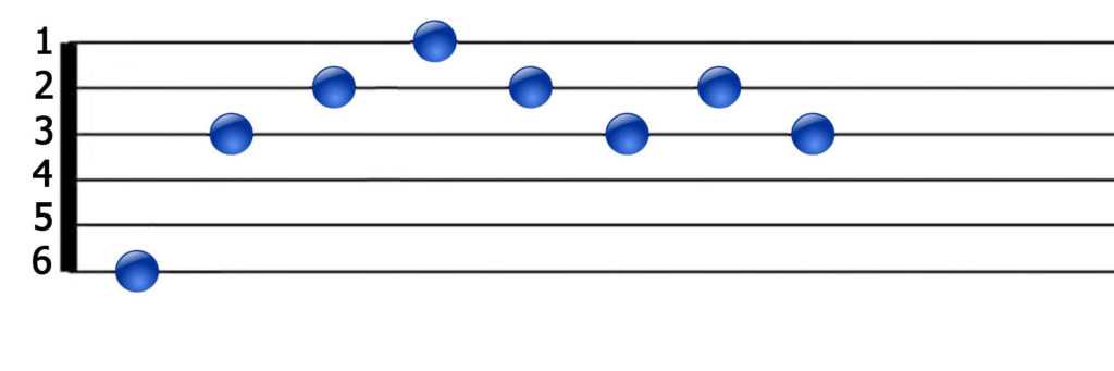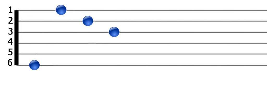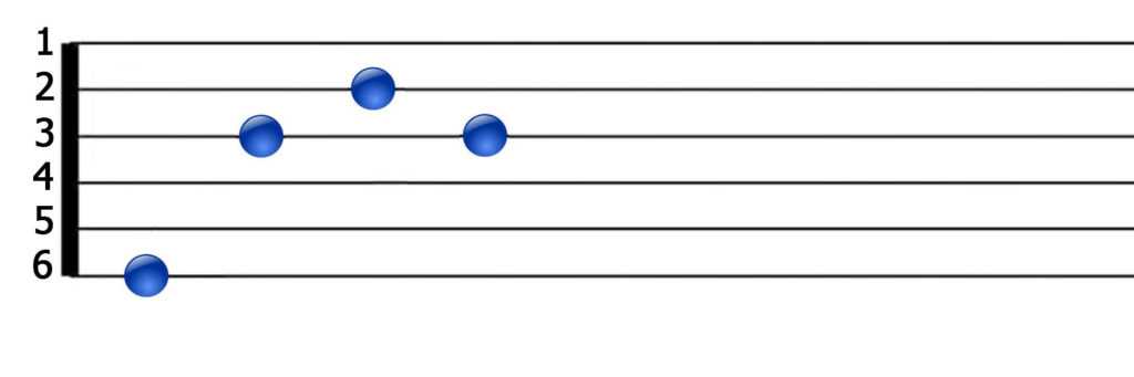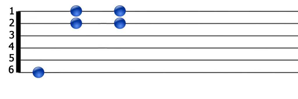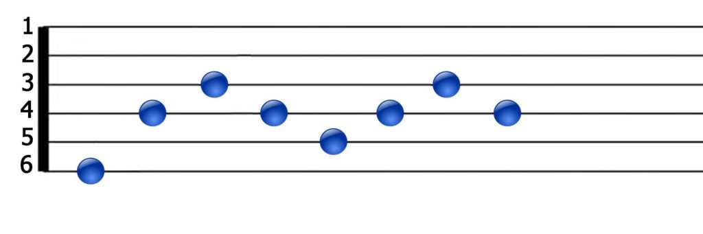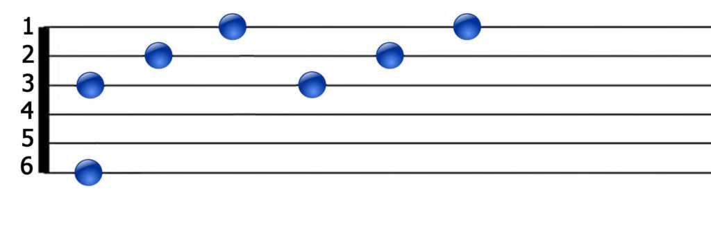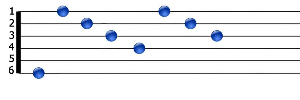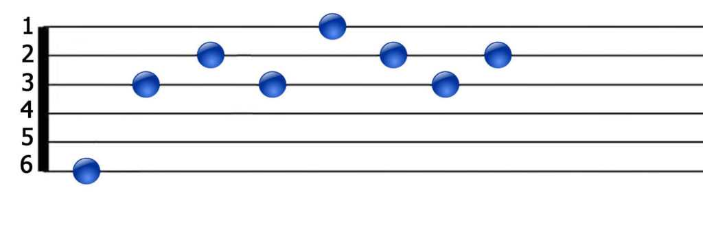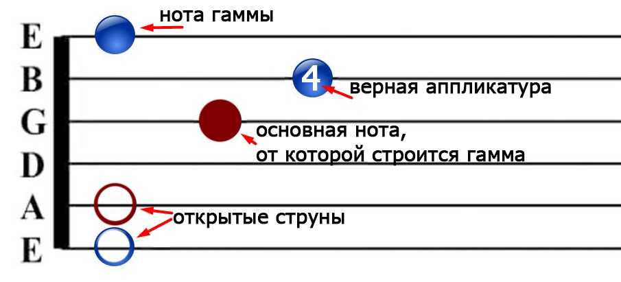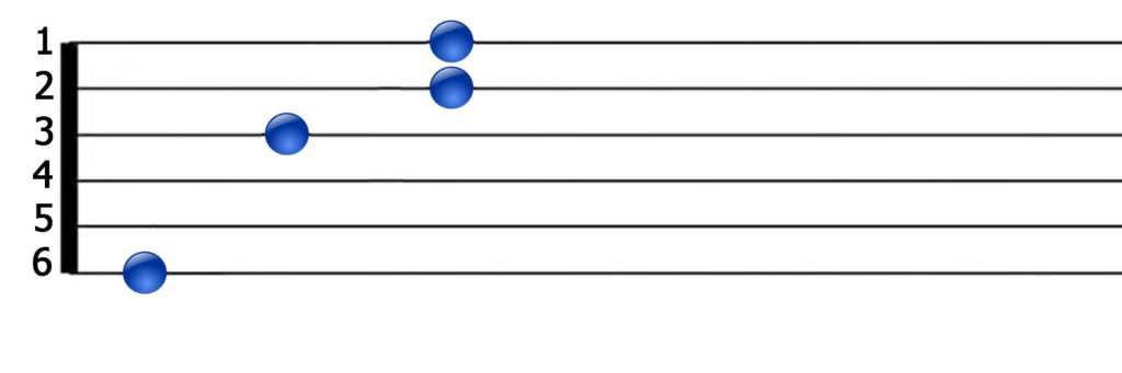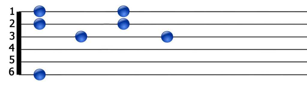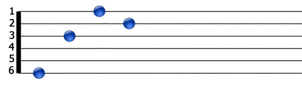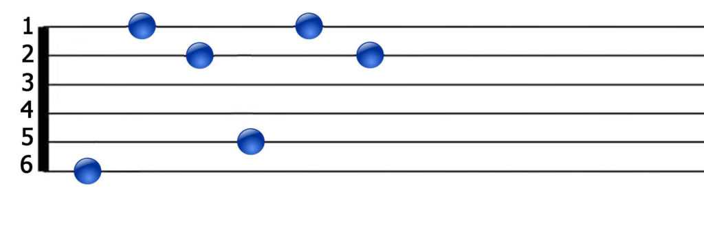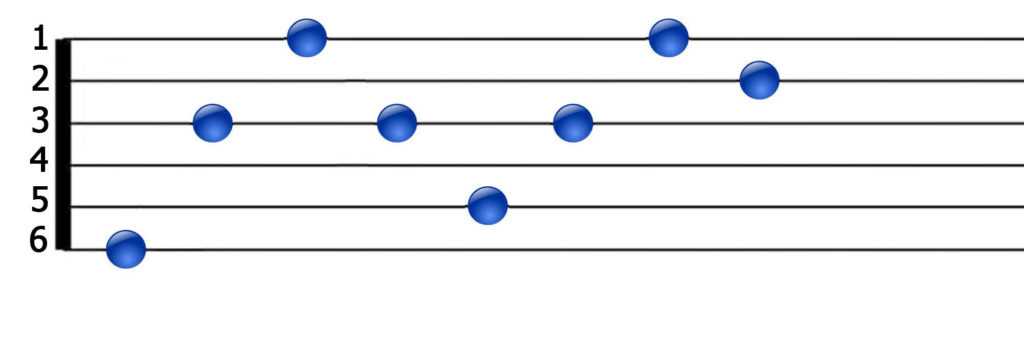 - Схема представляет собой 6 линеек по количеству струн. Первая находится вверху, шестая – внизу.