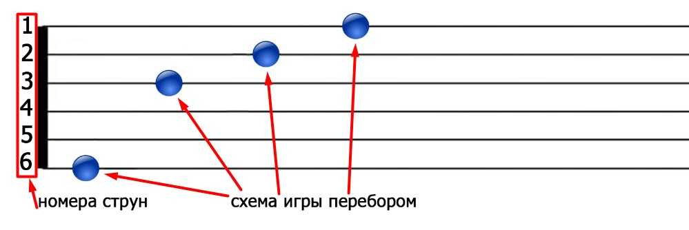 - Точки – последовательность, с которой нужно играть струны перебором.