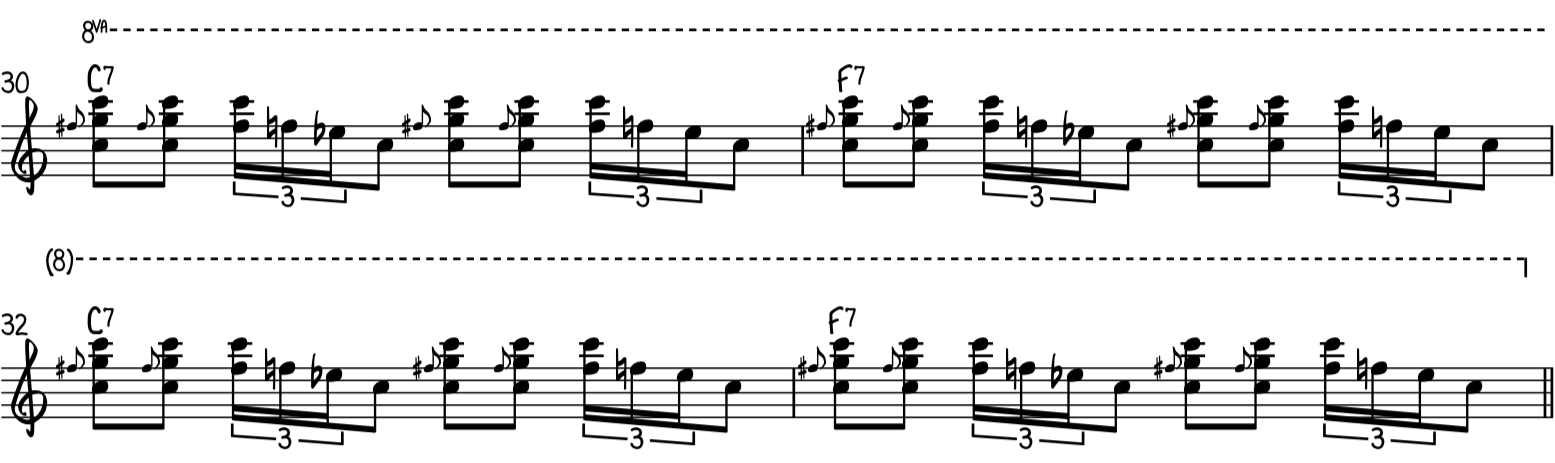 В этом примере мы играем первый и шестой вместе. Затем берем вторую открытую отдельно. Затем есть повторения.