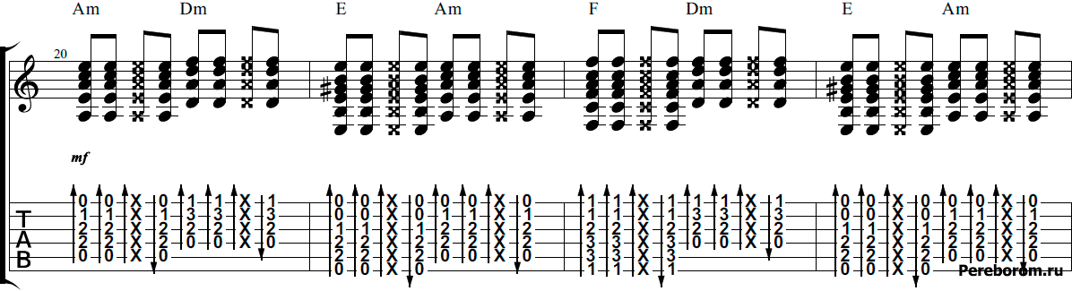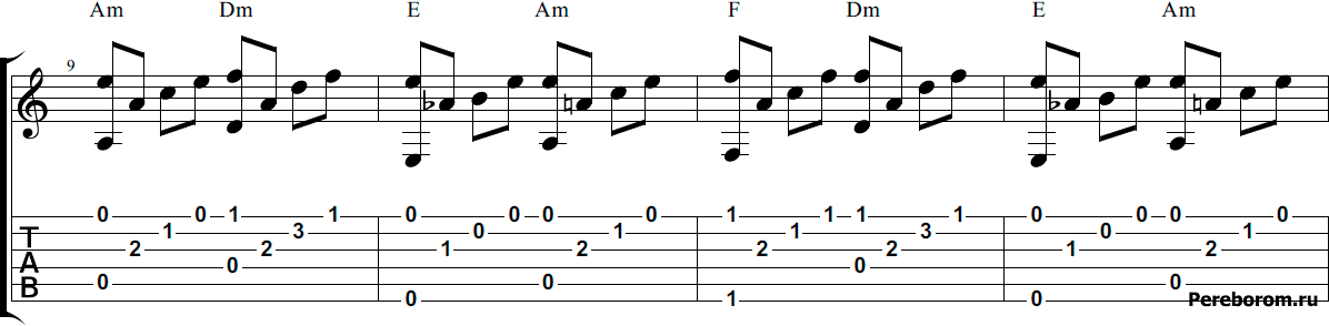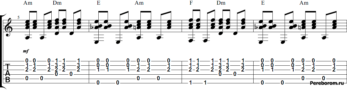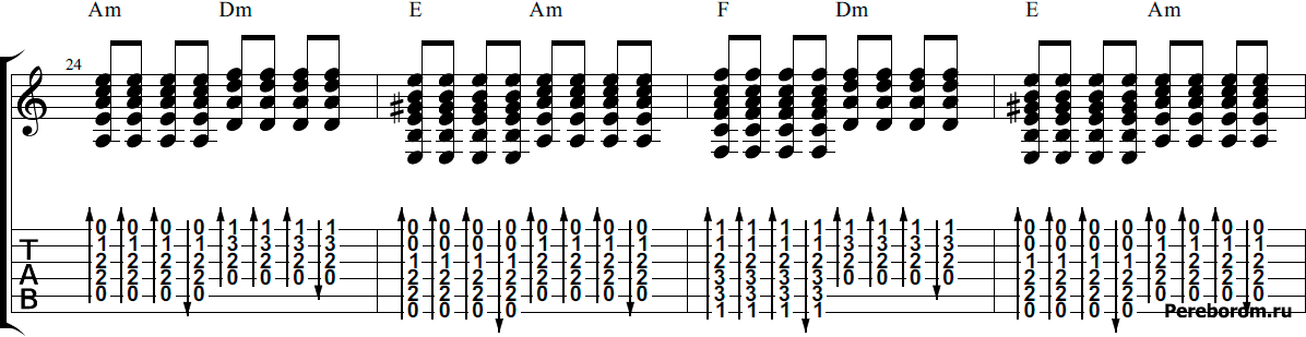 В этом варианте каждый аккорд сначала исполняется с басом (Am с открытой 5 и т.д.), затем играются струны в таком порядке – 3-2-1.
