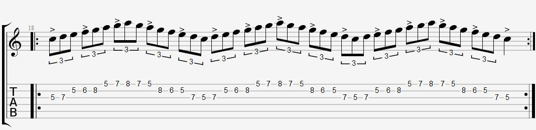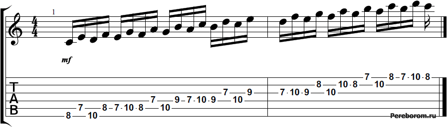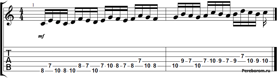 Оно очень похоже на первое упражнение, однако задействует сразу все струны. Оно так же начинается с восьмого лада и повторяет примерно одинаковый паттерн, потихоньку спускаясь вниз.