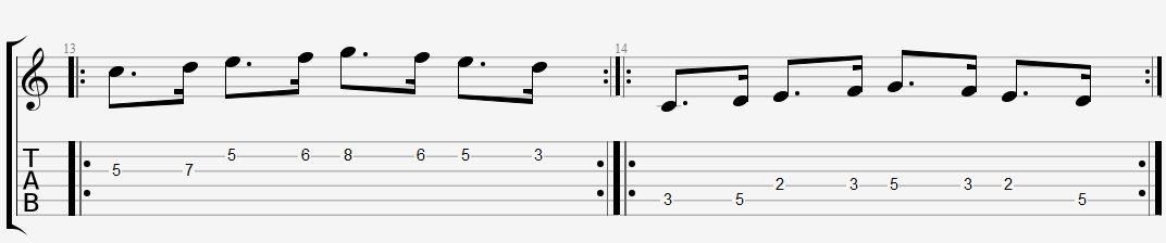 Первое упражнение начинается с восьмого лада и задействует четыре струны. Вы постепенно спускаетесь по ним, разыгрывая один и тот же паттерн внутри гаммы