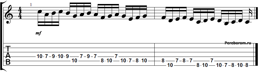 Эта схема начинается от десятого лада четвертой струны, то есть, по сути, его можно совместить с занятием выше. Оно играется переменным штрихом и постепенно поднимается по грифу.