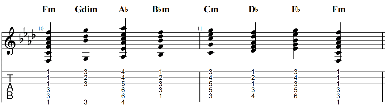 Как хорошо видно из табулатуры, аккорды в тональности «ми минор» имеют очень много открытых струн (там, где табы показывают 0 – это открытые струны). А в тональности «фа минор» абсолютно все струны в каждом аккорде нужно зажимать. Если все звуки на закрытых струнах, то делать плавные переходы при игре на гитаре и смене аккордов, практически невозможно, особенно, если приходится делать скачки на дальние позиции. Поэтому такая тональность считается не гитарной.