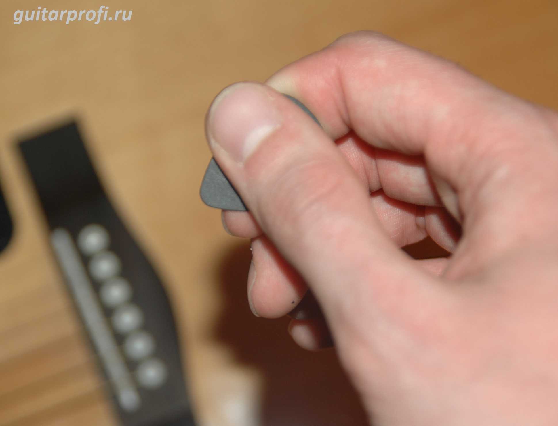 ? Медиаторы держат между указательным и большим пальцами руки — той самой руки, которой играют на гитаре бой и переборы. Пальцы должны покрывать как минимум половину площади пластинки медиатора.
